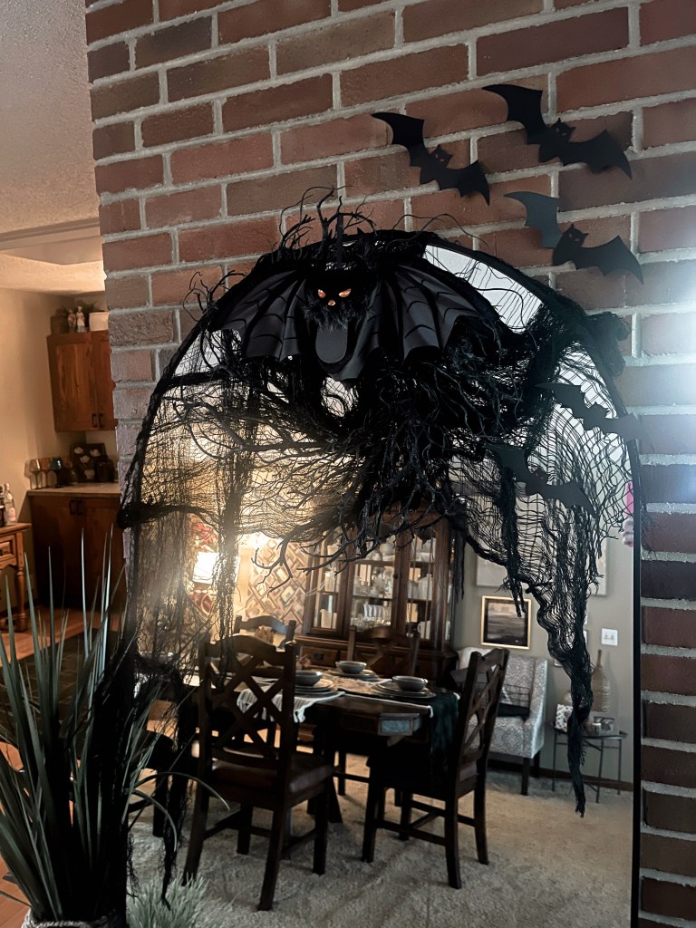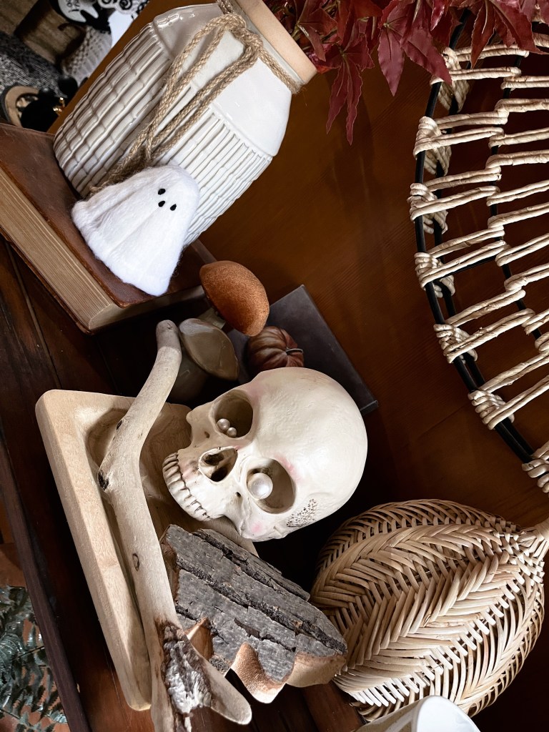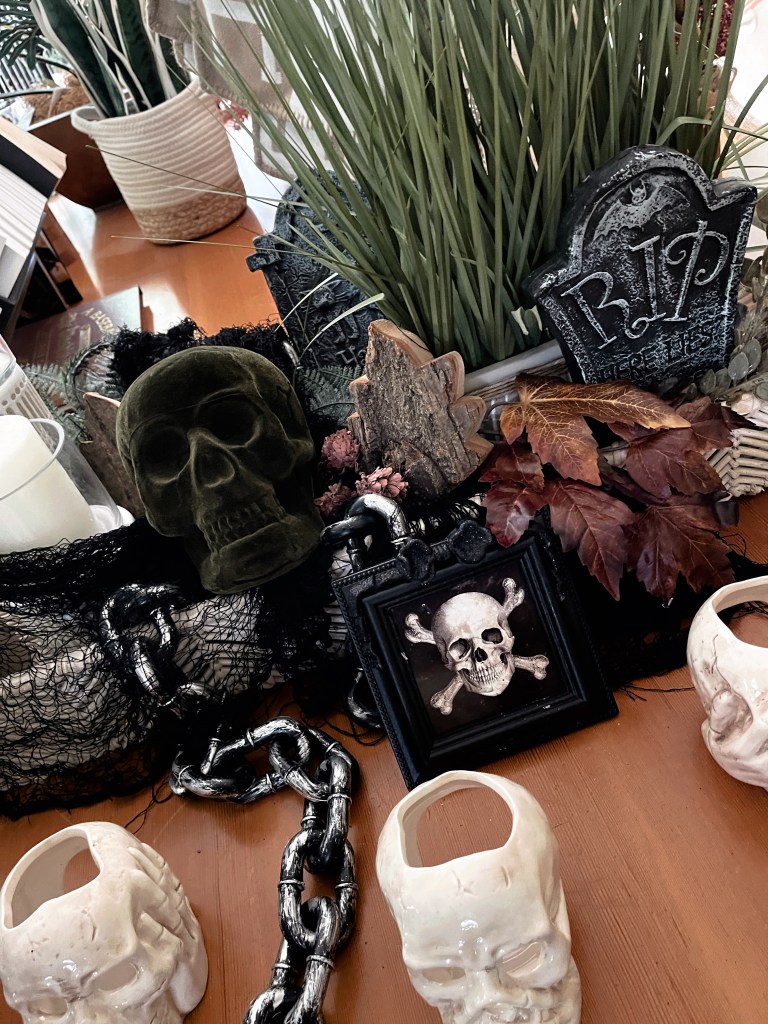 I also like to incorporate my fall decorations into my spooky ones so I don’t have to redo decorations for Thanksgiving–I just have to remove the spooky items and I am good to go!