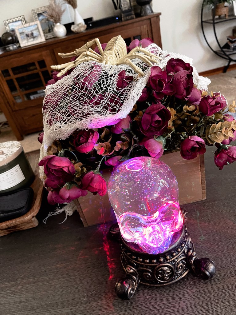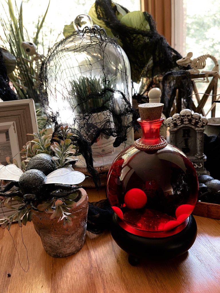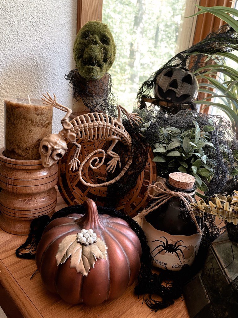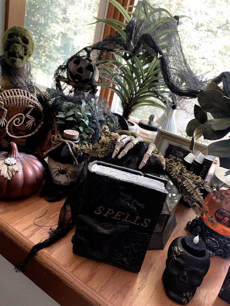 To help coordinate and decorate areas within my home, I put areas into themes. Entryways, mantals and window areas are great for decorations to create a fun & spooky setting. I like to use faux leaves and black netting to accent and add as fillers. I have a giant window in my home that I call the apothecary window and it is perfect to decorate with creepy potions and skulls. Also, things look better in groups and not spread out. Items have a more dramatic effect when displayed together.