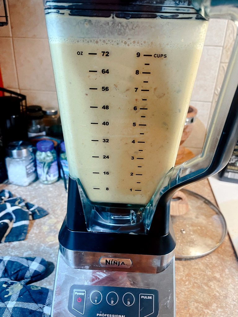 I added about 3 tablespoons of the spice mix and about a tablespoon of pepper & salt. I also added 3 tablespoons of chives. Bring to boil, then simmer 30-40 minutes. Then add some heavy cream. I added about a cup to a cup and a half. Simmer for another 10-15 minutes. Then pour into a blender. Blend until smooth. Or this can be done with an immersion blender as well. I have done both!